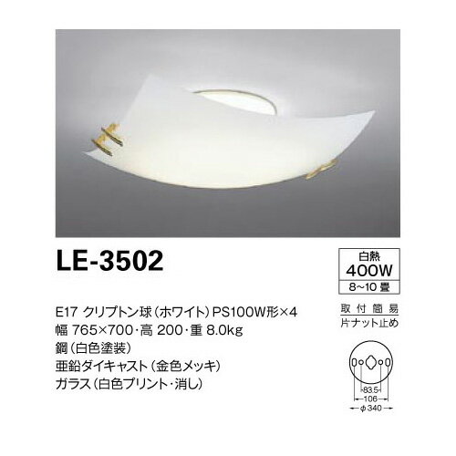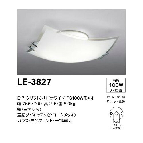 【ポイント2倍】山田照明 シーリング白熱灯 ArtsquareII シーリングライト LE-3504【代引不可】 価格: 48,600円 レビュー評価: 0.0 レビュー数:0 山田照明 シーリング白熱灯 ArtsquareII シーリングライト LE-3504 ■光源仕様:E17クリプトン球(ホワイト)PS60W形×4 ■寸法:幅640×580高192mm ■重量:6.8 ■材質仕上:鋼(白色塗装)/亜鉛ダイキャスト(クロームメッキ)/ガラス(白色プリント・消し) ■適用畳数下限:4.5 ■適用畳数上限:6 ■取付方法:取付簡易型 ■備考1:片ナット止め ■備考2:電球形蛍光灯(D15形)使用可能 ■総W数:240 ■ランプ種類:ミニクリプトン球 ■ランプ本数:4 取付・設置に関するサポート、落下等による責任、保証は一切ありません。商品の詳細はご注文前にメーカーサイ Supported by 楽天ウェブサービス |