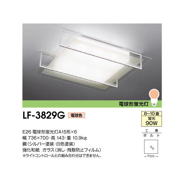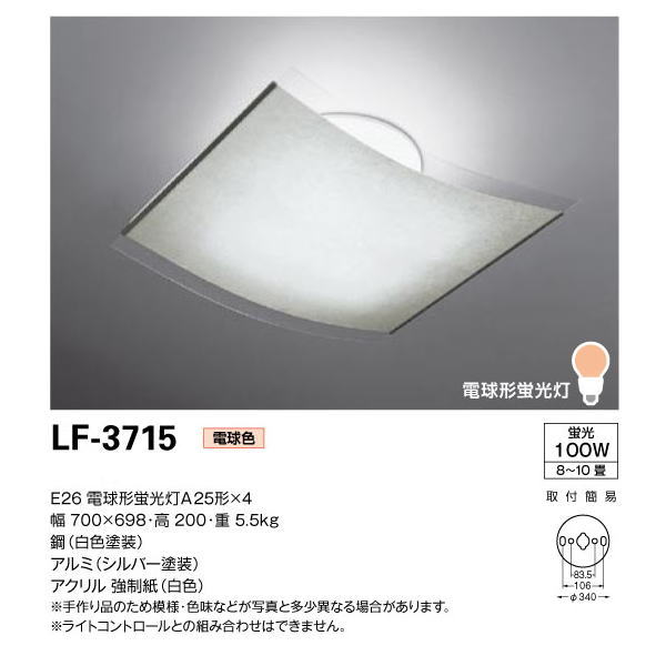 【ポイント2倍】山田照明 シーリング(蛍光灯) シーリングライト LF-3715【代引不可】 価格: 50,999円 レビュー評価: 0.0 レビュー数:0 山田照明 シーリング(蛍光灯) シーリングライト LF-3715 ■光源仕様:E26電球形蛍光灯(電球色)A25形×4 ■寸法:幅700×698高200mm ■重量:5.5 ■材質仕上:鋼(白色塗装)/アルミ(シルバー塗装)/アクリル/強制紙(白色) ■適用畳数下限:8 ■適用畳数上限:10 ■取付方法:取付簡易型 ■注意1:手作り品のため模様・色味などが写真と多少異なる場合があります。 ■注意2:ライトコントロールとの組み合わせは出来ません。 ■総W数:100 ■ランプ種類:電球形蛍光灯 ■ランプ本数:4 ■光源色(蛍光灯):電球色 取付・設置に関するサポート、落下等による責任、保証は一切あ Supported by 楽天ウェブサービス |
